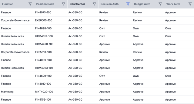 Risk and assurance teams depend on clarity around accountability and control design. Orgsure maps three types of authority: budget, decision, and execution at the position level, and tracks three categories of control: approvals, formal controls, and policies at the activity level. This dual view reveals where accountability overlaps, gaps, or conflicts exist across the organization. By integrating governance data with structural and role information, Orgsure enables precise evaluation of control coverage and segregation of duties. Risk, compliance, and audit professionals gain a clear, data-based line of sight from policy to execution, strengthening oversight and reducing systemic exposure.